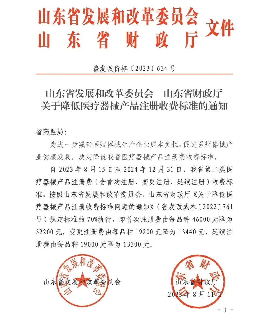 8月14日,山東省發(fā)展和改革委員會、山東省財政廳《關于降低醫(yī)療器械產品注冊收費標準的通知》: