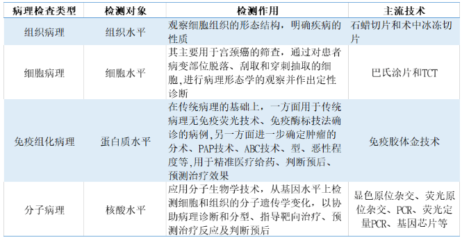 病理學根據發展階段的不同主要分為傳統病理技術(組織病理、細胞病理)、免疫組化病理和分子病理。傳統的組織病理建立在組織、細胞的水平上,可以通過病理醫師的顯微鏡診斷來判斷疾病的性質(炎癥性病變還是腫瘤型病變、良性腫瘤還是惡性腫瘤等);免疫組化病理建立在蛋白質水平上,可以進一步判斷腫瘤的組織來源、原發部位、病理分型、殘留邊緣癌細胞等,除了診斷作用以外還具有指導預后的作用;分子病理建立在核酸分子水平上,可以確定腫瘤的基因突變類型,用于后續靶向藥物的指導以實現精準醫療。