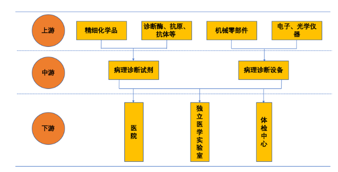 病理行業產業鏈包括上游原料市場、中游試劑設備市場和下游需求診斷市場。原料包括生物與化學原材料以及各種機械零配件,分子病理還會涉及到引物、探針等;中游包括病理診斷試劑和病理診斷儀器;下游需求主要來自于醫院、第三方獨立醫學實驗室、體檢中心、政府等。