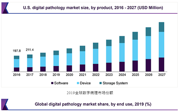 據2020年世界病理學大會報告,預計到2024年,病理學市場規模將從2019年的303億美元達到444億美元,從2019年到2024年的復合年增長率為6.1%。據GrandViewResearch預測,2019年全球數字病理學市場規模為7.676億美元,預計到2027復合年增長率為11.8%。根據最終用途,醫院在2019年占據了領先的市場份額。醫院采用數字掃描技術以加快診斷速度并提高患者依從性。就收入而言,2019年北美市場份額最大。