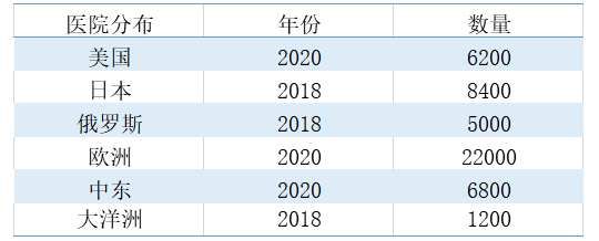 根據上圖所示,不完全統計表明2020年美國約有6200家醫院,歐洲約有22000家,中東約有6800家醫院,2018年日本有8400家醫院,大洋洲有1200家醫院,俄羅斯有5000家醫院。