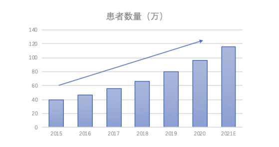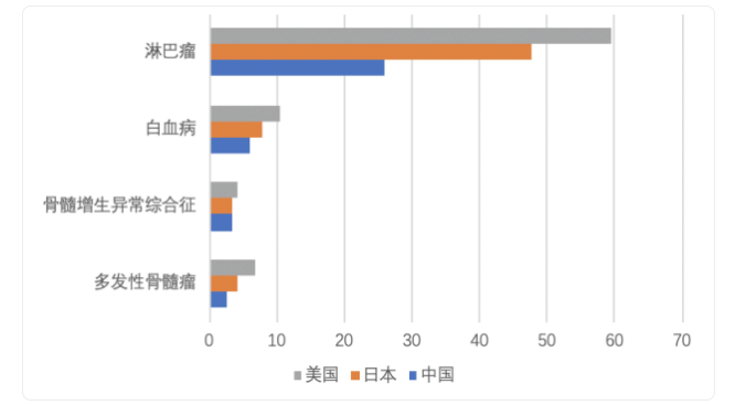 根據上圖所示,多發性骨髓瘤在中國、日本、美國的發病率分別為2.5/100000,4.4/100000,6.7/100000;骨髓增生異常綜合癥在中國、日本、美國的發病率3.4/100000,3.5/100000,4.2/100000;白血病在中國、日本、美國的發病率分別為6.1/100000,7.8/100000,10.6/100000;淋巴瘤在中國、日本、美國的發病率分別為25.9/100000,47.6/100000,59.4/100000。由此可見2008年-2015年的四種血液腫瘤發病率呈現逐年上升的趨勢,其中淋巴瘤發病率最高,平均高達44.3。