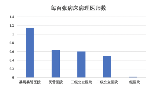 如上圖所示,其中委屬委管醫院每百張病床病理醫師數僅為1.15,三級公立醫院、二級公立醫院和民營醫院分別為0.60、0.50及0.64。根據最新發布的《2019年全國病理質量報告》顯示,在不同級別的醫院中,全國平均每百張病床病理醫師數量為0.55,病理醫師數量奇缺的狀況沒有改善,各省、自治區、直轄市均未達到2009年《病理科建設與管理指南(試行)》(以下簡稱《指南》)的最低要求(每百張床1-2名病理醫師)。