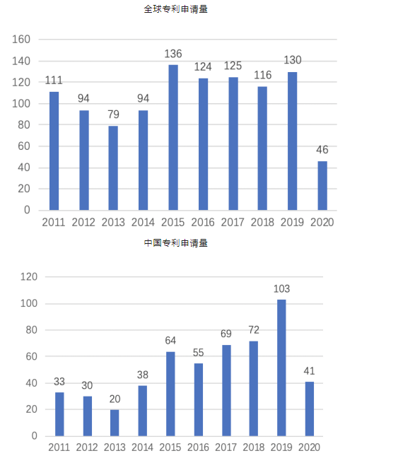 上圖所示為以“病理診斷”和“細胞病理”進行全球檢索得到的近10年的專利申請情況。從圖中可以看出,病理診斷領域近10年約有1055件專利申請(由于發明專利有18個月公開的滯后期,實用新型從申請到公開也需一段時間,因此2019年和2020年數據有所偏差),其中發明專利604件、實用新型專利179件。從圖2中可以看出,全中國病理診斷領域近10年約有525件專利申請(由于發明專利有18個月公開的滯后期,實用新型從申請到公開也需一段時間,因此2019年和2020年數據有所偏差)。
