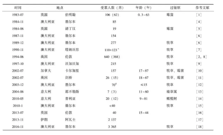 此后,陸續在全球范圍內均有雷暴哮喘事件的相關報道,主要發生在英國、澳大利亞,另外加拿大、意大利、伊朗等國家也有類似報道。(下方表格中總結了自1983年以來文獻報道過的雷暴哮喘事件)