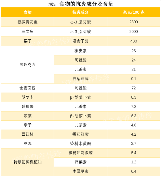 抗炎飲食可以改善體內的炎癥因子,避免發展出疾病。比如:碳水化合物:推薦全谷物碳水化合物,比如藜麥、糙米、蕎麥、黑米等等。脂肪:多選擇單不飽和脂肪酸和多不飽和脂肪酸,比如魚蝦、貝類、亞麻籽油等含有多不飽和脂肪酸、歐米伽-3型脂肪酸。蛋白質:選優質蛋白質,如魚、家禽、雞蛋、瘦紅肉,以及低脂乳制品和大豆食品。蔬果:十字花科蔬菜和莓果類是最被推薦的“抗炎選手”。富含多酚、黃酮的食物:如綠茶、大豆等;香辛料:如姜黃、生姜、肉桂、肉蔻、大蒜等等在“抗炎飲食”榜上有名。⑥2023年5月國家注冊營養師谷傳玲根據文獻研究,整理出了12種“抗炎王者食物”,供大家日常飲食中參考。